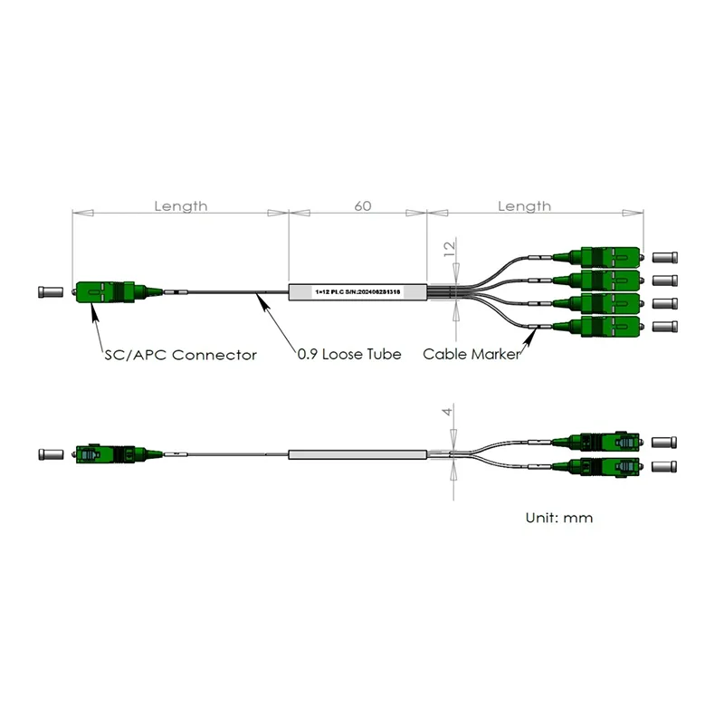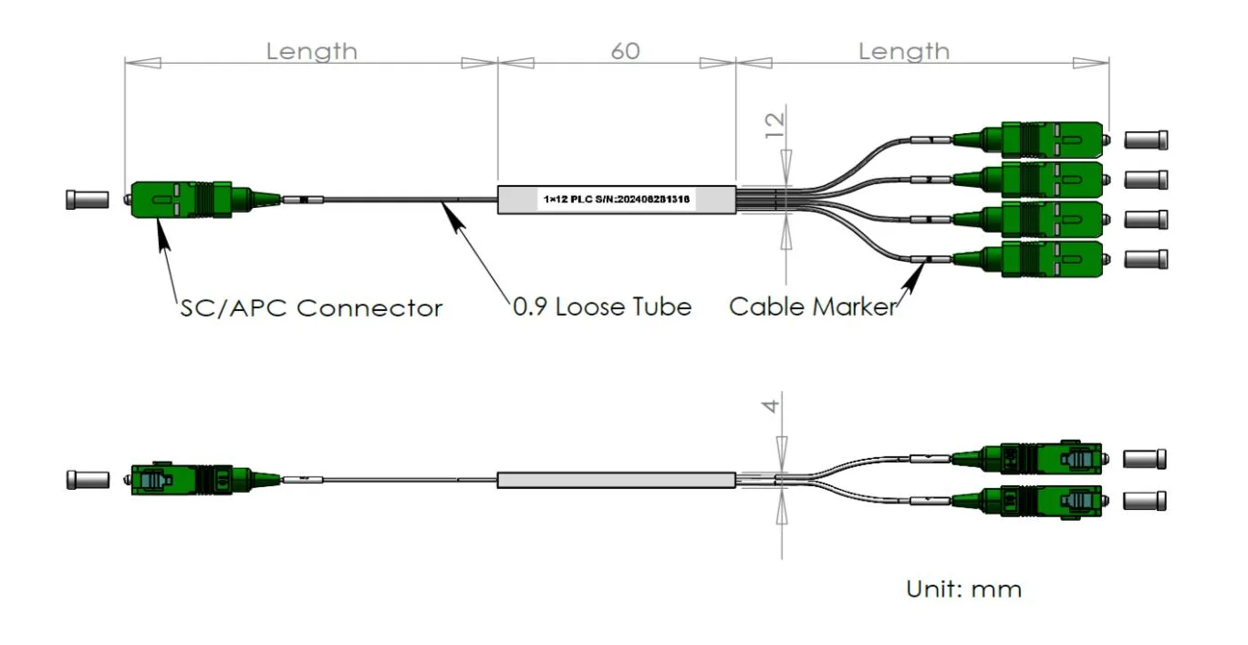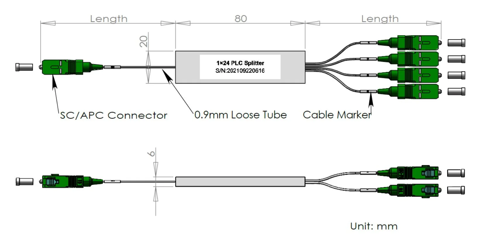 1x12/1 × 24 পিএলসি স্প্লিটার স্টিল টিউব প্যাকেজ 60x12x4 এবং 80x20x4 মিমি, 900μm আলগা টিউব 1.0+0.1/-0m, এসসি/এপিসি সংযোগকারী সহ।