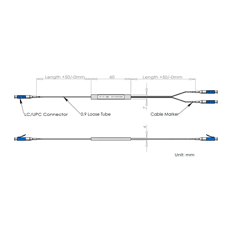 1 × 2 পিএলসি স্প্লিটার স্টিল টিউব প্যাকেজ 60x7x4 মিমি, 900μm আলগা টিউব দৈর্ঘ্য 1.0 মি, এলসি/ইউপিসি সংযোগকারী সহ।